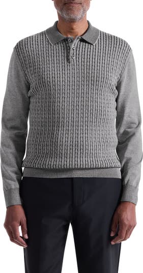 A warmer take on the versatile favorite, this polo sweater is knit from soft cotton-blend yarns and features cable stitching at the body for stylish texture.