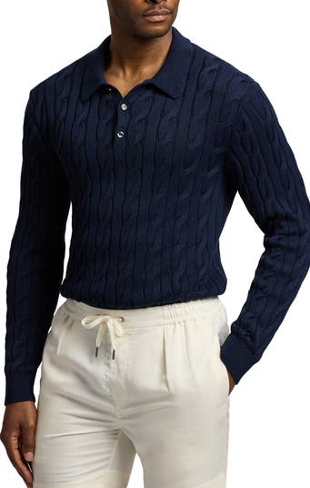 Cable Stitch Long Sleeve Cotton & Mulberry Silk Polo Sweater
