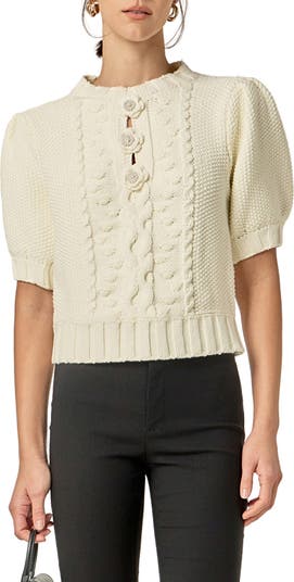 Beaded blooms charm this cotton-blend sweater knit with cozy cable stitching and framed by darling puff sleeves.