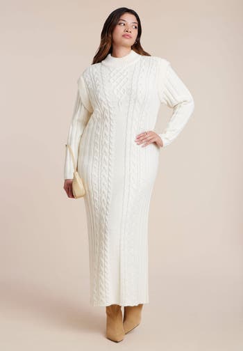 - A fresh take on the cable knit: this cable-stitch sweater maxi dress flows from a relaxed bodice to a figure-skimming skirt. The mock neck and long sleeves create an elongated, elegant line.