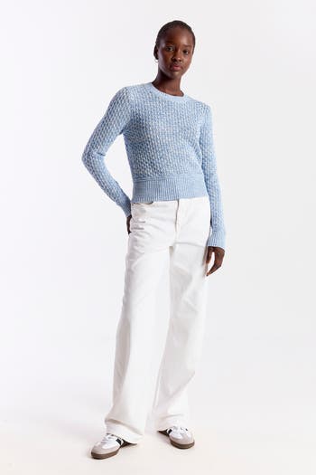 Cable knit crew, sculpted at the waist for a flattering silhouette, plush texture for everyday comfort and easy layering from morning errands to relaxed evenings.