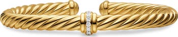 Pavé diamonds wrap the center station of this flexible 18-karat gold cuff bracelet done in the label's signature cable spiral texture.
