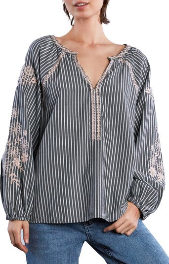 Patterned stitching brings an enchanting attitude to this billowy striped top that's ideal for stepping out in the sun.