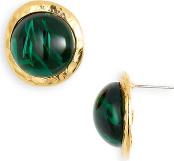 Artfully hammered halos frame polished faux-emerald cabochons on these stunning button stud earrings.