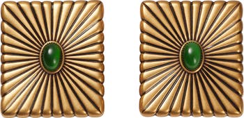 A verdant cabochon and radiating lines create dynamic drop earrings antiqued with an aged finish.