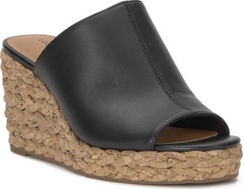 Braided cork-textured cording glints with metallic flecks on this platform slide sandal raised on a lofty wedge heel and fitted with a ribbed rubber sole.