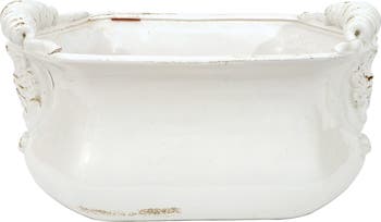 This white distressed terra-cotta cachepot is a lovely way to display plants or flowers. This rectangular cachepot has a smooth surface and a distressed white finish that gives it a weathered and aged look. The white color makes the plants or flowers stand out and brighten up any room. This cachepot is made of durable terra-cotta, a natural and durable material that breathes well and retains moisture. Alternatively, this cachepot can be used as a decorative container for dried or artificial arrangements. This cachepot measures 16 inches in length, 10 inches in width, and 8 inches in height. It can hold a large pot or several small pots. It can fit medium to large-sized plants or flowers such as roses, hydrangeas, orchids, or lilies. This cachepot is suitable for a farmhouse, country, or vintage style home décor. It will add some charm and character to the space. This white distressed terra-cotta cachepot is a wonderful way to showcase plants or flowers.