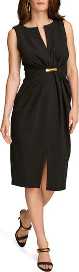Tailored in smooth crepe, this streamlined cocktail dress features architectural waist pleats, gold hardware and a front slit for poised, effortless sophistication.
