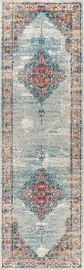 Featuring a floral central medallion and a cheerful Bohemian color scheme, our Cadiz rug adds a vintage vibe to your living room, bedroom, or den. The coral pattern on an aqua and ivory ground has a timeworn, faded effect. Power loomed from synthetic materials, it is as durable as it is beautiful.