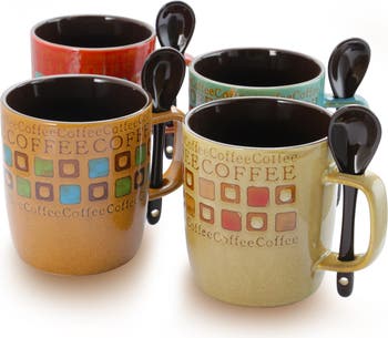 - COFFEE MUG SET INCLUDES 4 cups ( 14 oz each ) and 4 spoons, Assorted colors