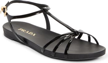Slim polished straps form a T-strap design on this chic flat sandal crafted in Italy and fastened with a golden buckle.