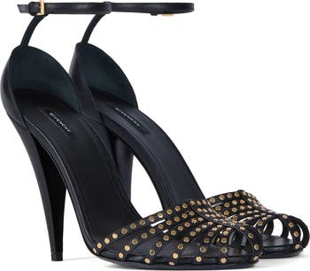 Elevate your evening attire in this calfskin-leather sandal with golden studs adorning the cage vamp and a tapered heel enhancing the sleek, fluid silhouette.