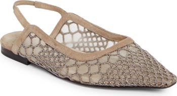 Signature monili beading is crocheted into the cagelike, mesh-lined upper of this pointy-toe slingback crafted in Italy and featuring velvety-soft suede.