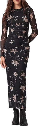 A blossom-tossed dress is closely cut from airy mesh and eased with a slit at one side.