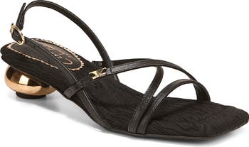 A lustrous, cylindrical heel brings artisanal charm to a strappy sandal featuring an angular square toe and adjustable buckle closure.