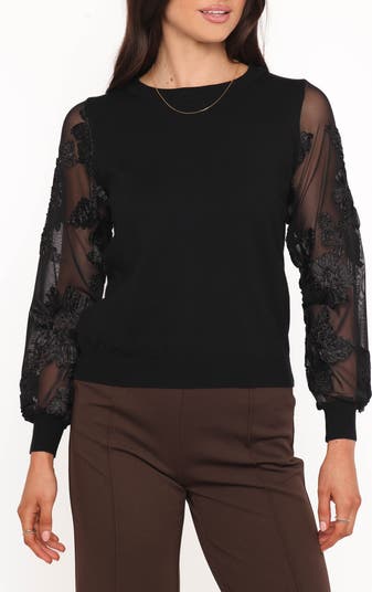 Sheer mesh sleeves with floral appliqués frame this lightweight knit top that adds dreamy style to any look you pair it with.