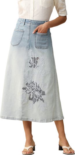 Tell everyone you're just 'throwing on a denim skirt' and then come through in this unexpected option enhanced with a dual-tone fade and pearly blooms.