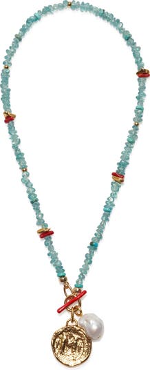 Blue apatite, coral and turquoise beads evoke the beauty of the sea on this striking necklace centered by an enameled toggle with freshwater pearl and coin charms.