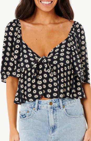 An empire waist gives a romantic look to this flowy top designed with ties at the neck and framed by fluttery sleeves.