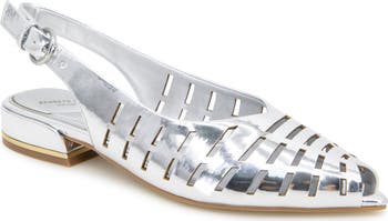 A pointy peep toe and geometric perforations create a futuristic aesthetic on a metallic slingback flat set on a cushioned footbed and barely-there block heel.