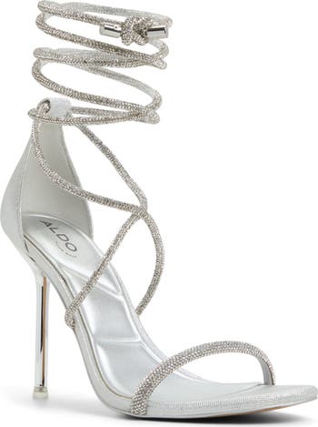 Rhinestone-encrusted straps twirl around the ankle of a glamorous metallic sandal set on a dual-density foam footbed and lofted by a tapered pin heel.