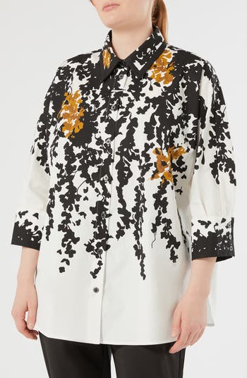 A unique, shadowy print lends eye-catching appeal to a button-up shirt cut from pure cotton for a comfy option on desk-to-dinner days.