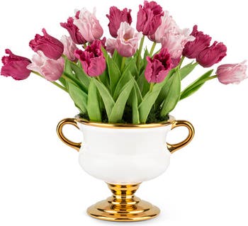 Sophisticated and vibrant, the Calder RealTouch Tulip Pedestal Arrangement features a stunning blend of fuchsia and lavender RealTouch parrot tulips, each meticulously crafted to achieve a lifelike appearance. Nestled in an intricately designed white and gold pedestal bowl with elegant handles, this arrangement exudes timeless beauty and grace. Perfectly placed for an artful display, it brings a burst of color and refined elegance to any space. A lasting luxury, timeless and unrivaled.