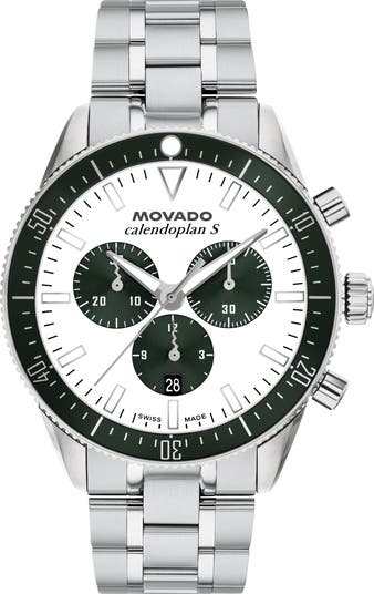 Inspired by Movado's rich archive of classic timepieces, this updated interpretation of the original Calendoplan model features a sleek, highly polished case, three-eye chronograph complication and a coin-edged bezel. A durable stainless steel bracelet composed of mixed-finish links completes the look.
