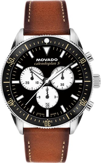 Inspired by Movado's rich archive of classic timepieces, this updated interpretation of the original Calendoplan model features a sleek, highly polished case, a three-subdial chronograph complication and a coin-edged rotating bezel. A vegetable-tanned leather strap completes the look.