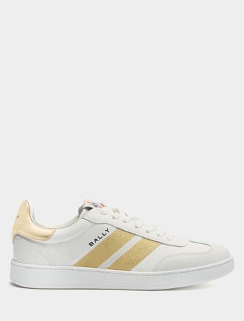 This Retro Crest sneaker in white calfskin is elevated by the shimmer of golden details, seen on the Bally Ribbon on the quarter and the leather heel tab. A Bally Crest label adds an iconic accent to the tongue, just above the flat woven laces.