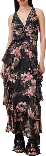 A ruched bodice and a floaty tiered skirt give party-ready flair to this lightweight cocktail dress.