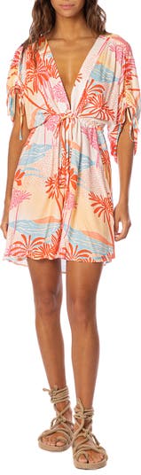 Dip your toes in the sand wearing this breezy cover-up mini featuring a colorful tropical print and centered with a tie waist for shape.