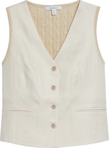 This hybrid vest is designed with a cabled sweater-knit panel in back and a tailored twill front panel complete with welt pockets.