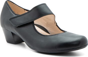 An adjustable mary jane strap lends retro-inspired styling to a polished pump framed by an almond toe and stacked block heel.