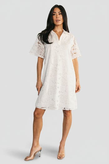 Baltic Born exclusive style Perfect for a patio brunch, sunset walk, bridal showers, and much more! Off white color Lace material with no stretch V-neckline with stylish folded collar Short sheer sleeves Shift dress fit Lined excluding sleeves