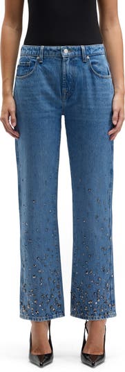 A mix of gleaming rhinestones adds a vintage vibe to these nonstretch jeans made with a mid-rise waist and ankle-length straight legs.