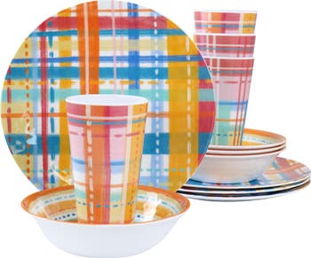 The Casablanca 12 piece melamine dinnerware set by Laurie Gates is perfect for family dining. Lightweight melamine construction is safe for kids and can be used both indoor and outdoor for versatility. This melamine set is designed with a multi colored gingham pattern that will make any meal a little brighter and more fun. This 12piece dinnerware set is great when it comes to sharing with friends and family, gathering outdoors, and enjoying a summertime BBQ meal. Includes service for four with dinner plates, bowls, and tumblers. Item Dimensions: 11.00" x 10.75" x 5.50" Item Weight: 5.25lbs