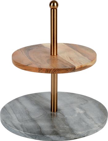 Serve your favorite apps in style with this marble and Acacia wood two tiered server by Laurie Gates! This gorgeous server is constructed with mixed materials that will bring a modern and stylish look to your home. Use this server as an every day staple piece, or take out for special occasions when guests come to visit. 2 tiers allows you to serve pastries, appetizers, finger foods, cheese and crackers, and more! Mix and match with other pieces from the collection to create gorgeously coordinated displays. Item Dimensions: 12.00" x 12.00" x 14.00" Item Weight: 8.75lbs