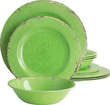 The Laurie Gates Mauna 12 Piece Melamine Dinnerware Set in Green is constructed with a lightweight yet durable melamine material that is perfect for both indoor casual dining and outdoor use. This distressed crackle design by Laurie Gates is fashion forward and fun, giving this set a new look that will catch the eye! Includes dinner plates, dessert plates, and cereal bowls, completing service for four! Top rack dishwasher safe melamine makes clean up a breeze. Item Dimensions: 11.20" x 11.20" x 5.80" Item Weight: 6.40lbs