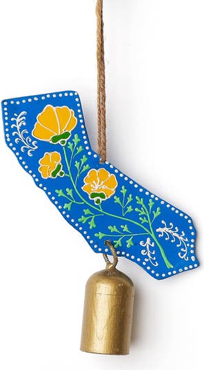 The California State Flower Poppy Wind Chime features a handcrafted shape of California state metal ornament with a small dangling metal bell.