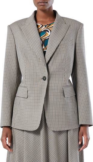 A single button closure enhances the tailored silhouette of this wool blazer covered in polished plaid.