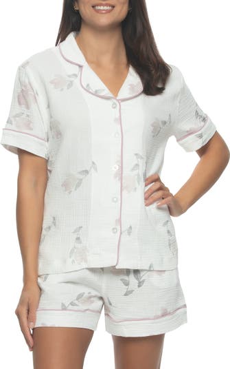 Keep cool on warm nights while looking polished in these lightweight pajamas cut from cotton gauze and covered in a flowery print.