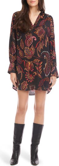 A swirling floral print emboldens this drapey shift framed by billowed sleeves and finished with an easy shirttail hem.