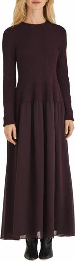 This elegant mixed media maxi dress in Ivory effortlessly blends comfort and sophistication. Featuring a fitted sweater knit bodice and a flowing chiffon woven skirt, it strikes the perfect balance of structure and fluidity, making it ideal for any occasion. With long sleeves, a classic round neckline, and dramatic maxi length, this versatile dress offers a graceful silhouette for both day and night.
