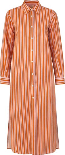 Elissa a long tunic dress, with point collar, button up front and cuffed long sleeves. Made in an Italian linen/cotton voile with market stripes. Made in Italy.