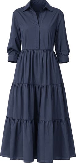 Marseille is a short sleeve fitted shirt dress which flares from a gathered waist to create three tiers of gathering. It is made of stretch cotton poplin