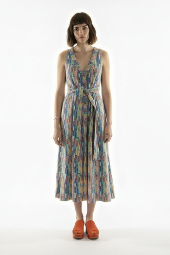a sleeveless dress with a v neck button placket, side pockets and a removable fabric belt.