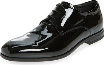 Subtle logo debossing and a streamlined profile define an Italian leather derby featuring a squared-off toe and durable rubber sole.