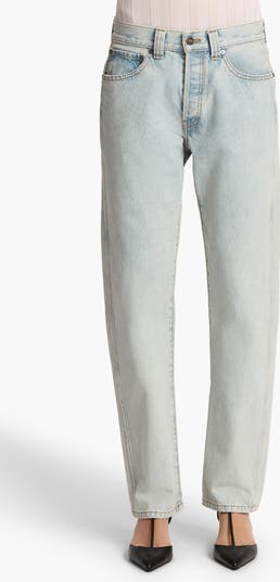 The New York-based label brings a new silhouette to its denim lineup with this nonstretch pair cut with a low rise and a slightly bowed leg ending in a chic taper.