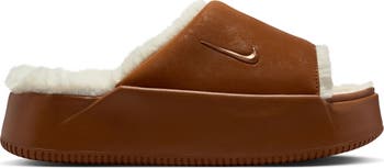 Plush faux fur wraps every step in luxe softness in a slide set on a contoured footbed and modest platform that elevate both the comfort and the stature. Topped with synthetic leather and grounded on grippy rubber, it makes a standout foundation for any favorite look.